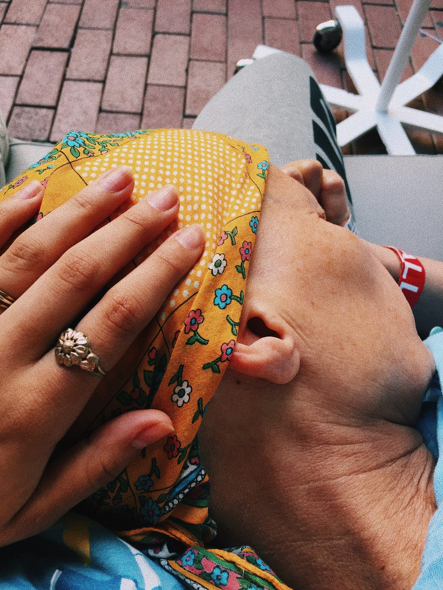 She’d lay in the garden, head on my lap, breathing in the air with the humming bees. Breathing in baby blue hyacinth and dusty pink roses. And then the chemotherapy alarm would sound, and she’d wistfully return to her room.